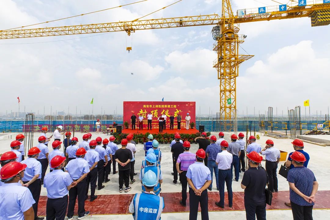 在喜迎中國共產黨建黨100周年和蘇中建設成立72周年之際,海安市重點民生工程——上湖醫院EPC項目經過蘇中人9個多月的日夜奮戰順利封頂,并于6月29日上午舉行了隆重的主體結構封頂儀式。海安市上湖創新區黨工委書記陳崇進、管委會主任楊治,市建管局局長賈伯根,市人民醫院院長張建平,市住建局總工程師夏永琴,市質監站站長段堃,浙江大學建筑設計研究院院長陳建,上湖醫院工程項目總監徐國,蘇中建設總裁陳永明、副總裁張偉、江海區域公司總經理王祥等領導嘉賓出席儀式。